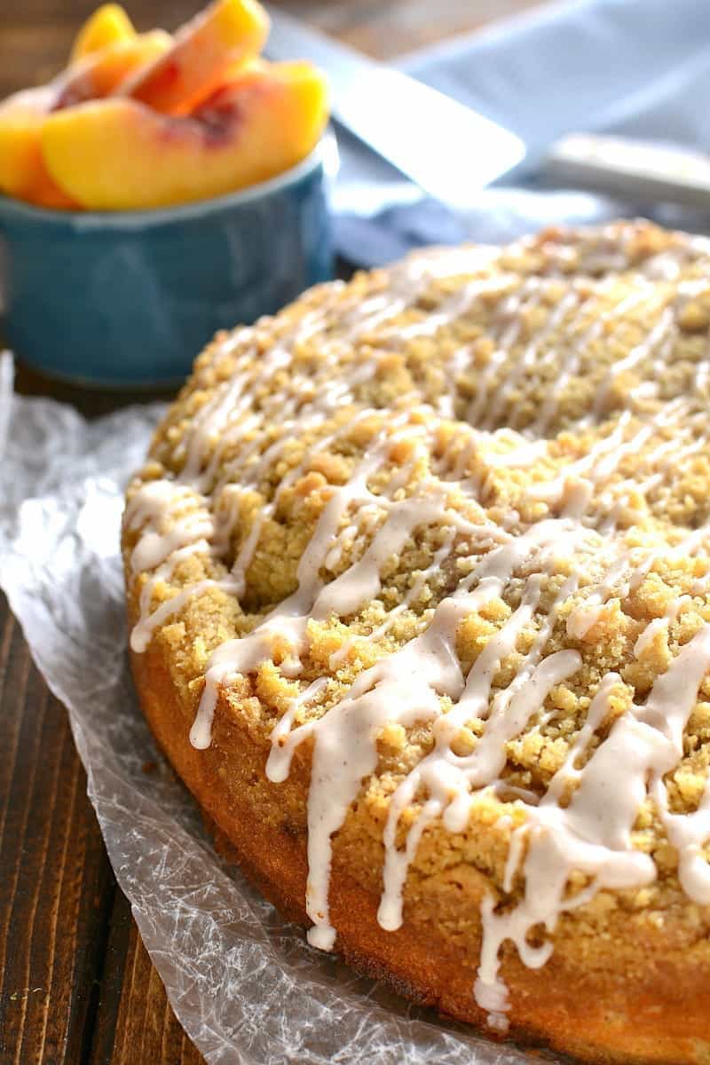 This dessert combines the ease of a moist cake infused with fresh sliced peaches and finished off with a crumb topping. This decadent coffee cake is so versatile: it makes the perfect breakfast cake, afternoon snack, and an after dinner dessert. It’s easy to make and outrageously delicious!