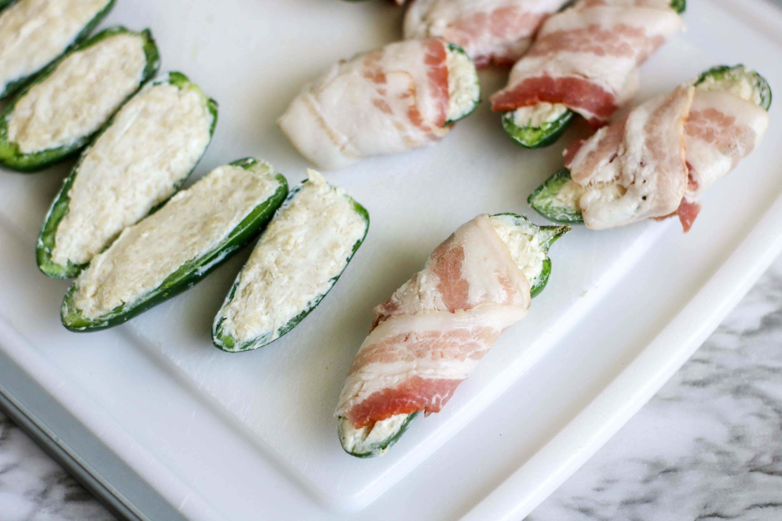 - Slice the bacon in half, and wrap around each Jalapeno half