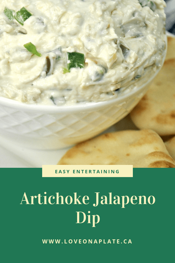 The kick from the Jalapeno’s is offset by the coolness of the sour cream and cream cheese however the marinated artichokes add a little extra pop of flavour. I like to serve this dip with mini pita’s or naan cut into pieces. Cut vegetables are a good option as well.