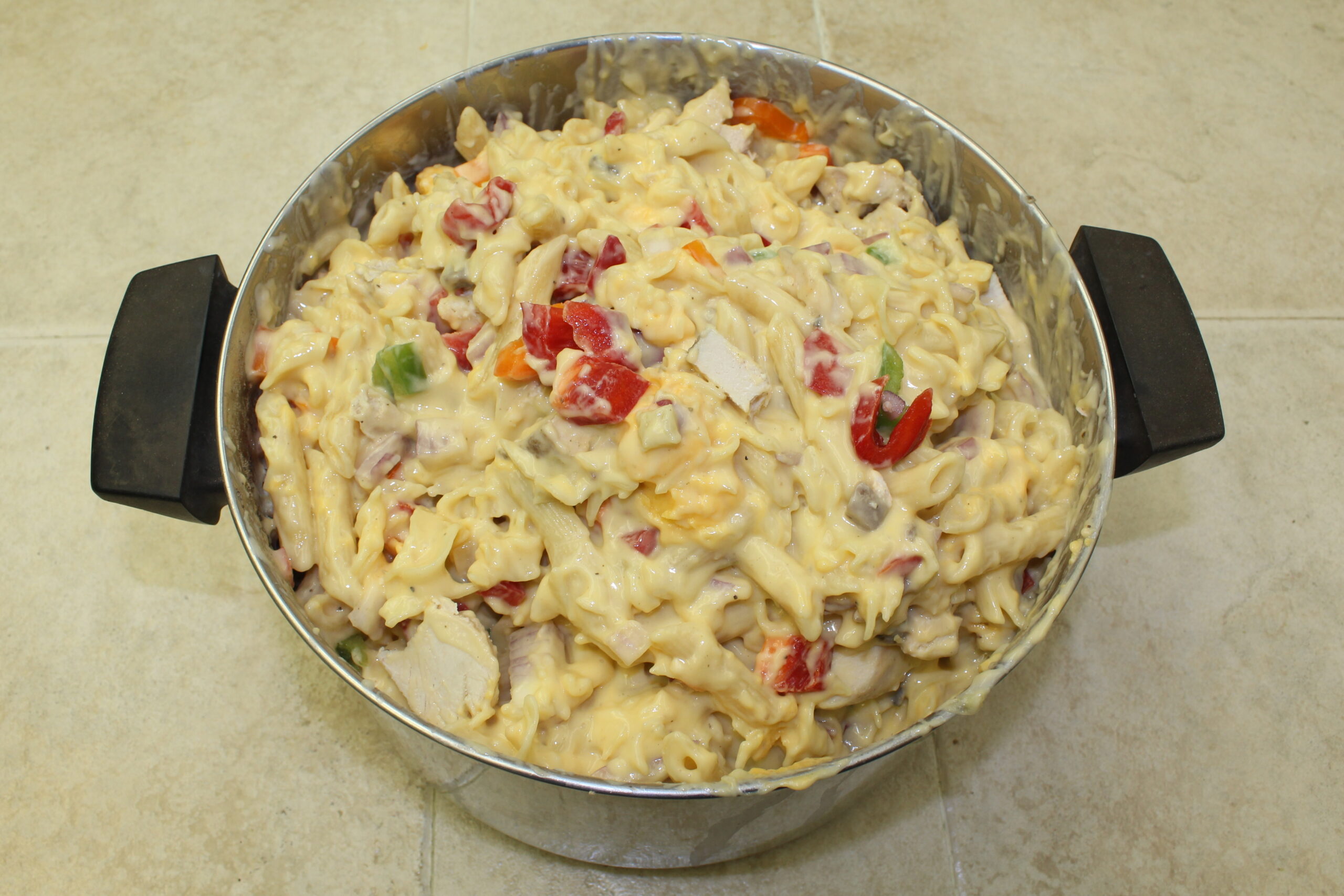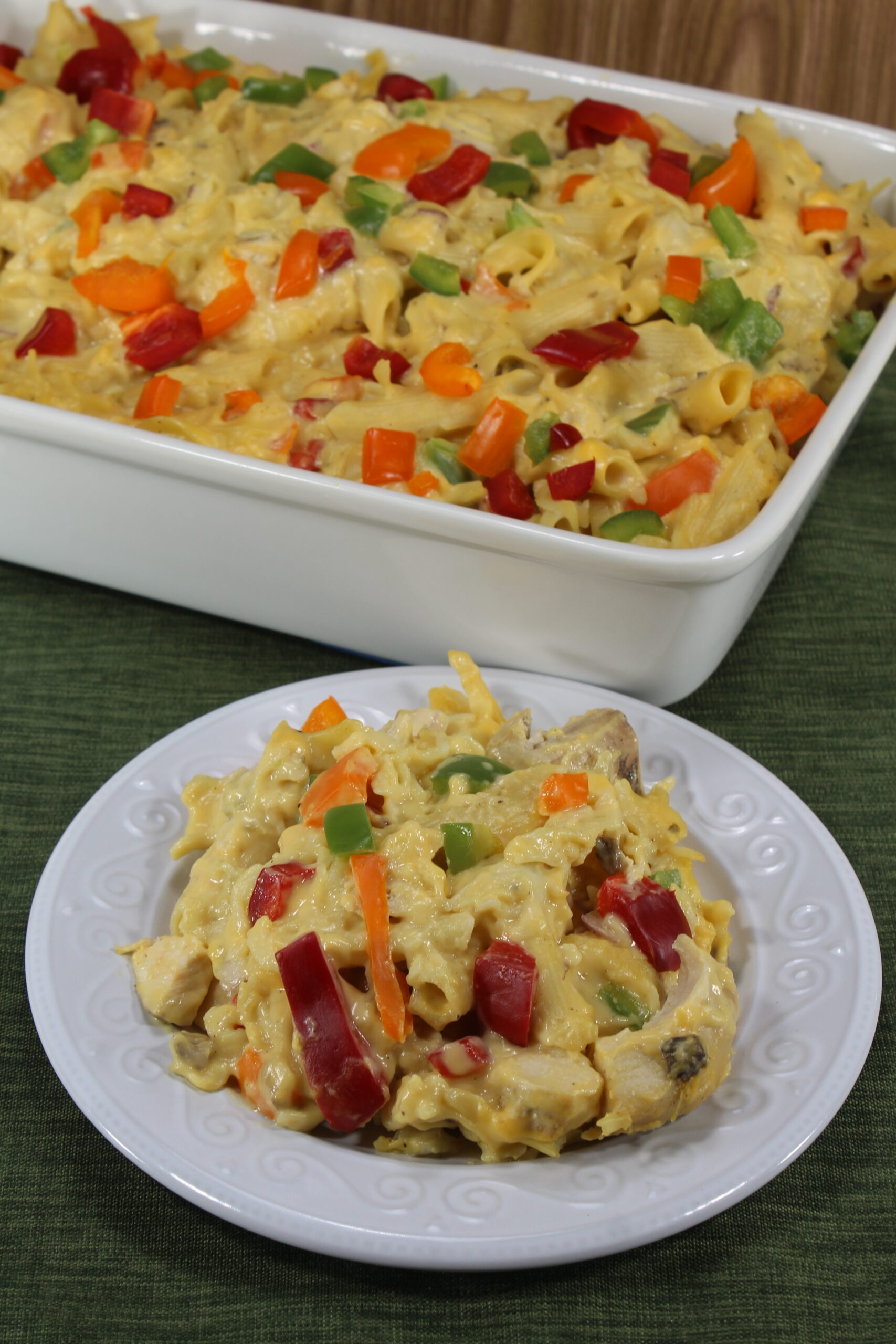 Chicken, peppers, onions and pasta baked in a cheesy sauce is the ultimate comfort food. This recipes feeds a crowd,
