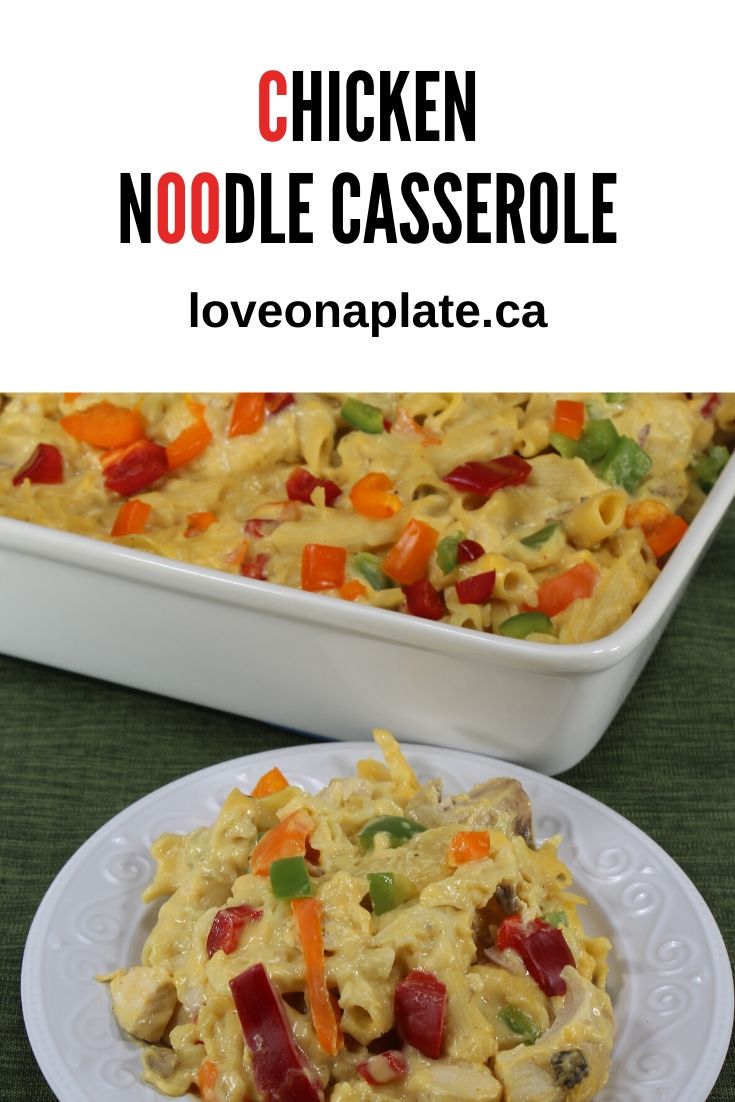 Cheesy Chicken Noodle Casserole is the perfect dish when you need some good down home comfort food to feed a crowd. It’s rich and creamy and makes a lot! This casserole will easily feed 6, with leftovers for lunches. Have a smaller family? Cut the recipe in half or freeze the extra. If you have picky eaters this is easily adjusted to accommodate what they like. I’s totally flexible and one of the reasons I like it so much. Leave out the onion, or peppers, choose a different cream of soup flavour, or add a bread crumb topping are just a few changes you can easily make.