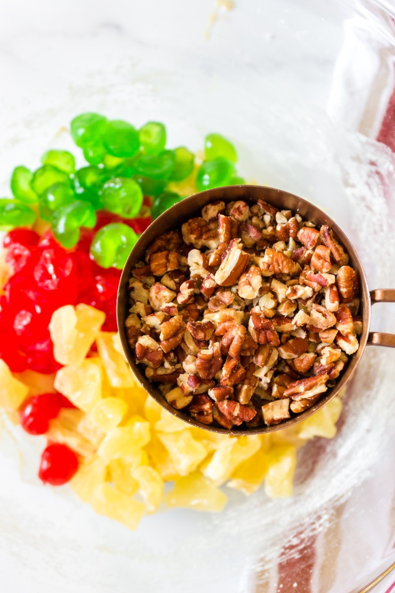 - Add the flour and baking soda and mix well. Fold in fruit and pecans.