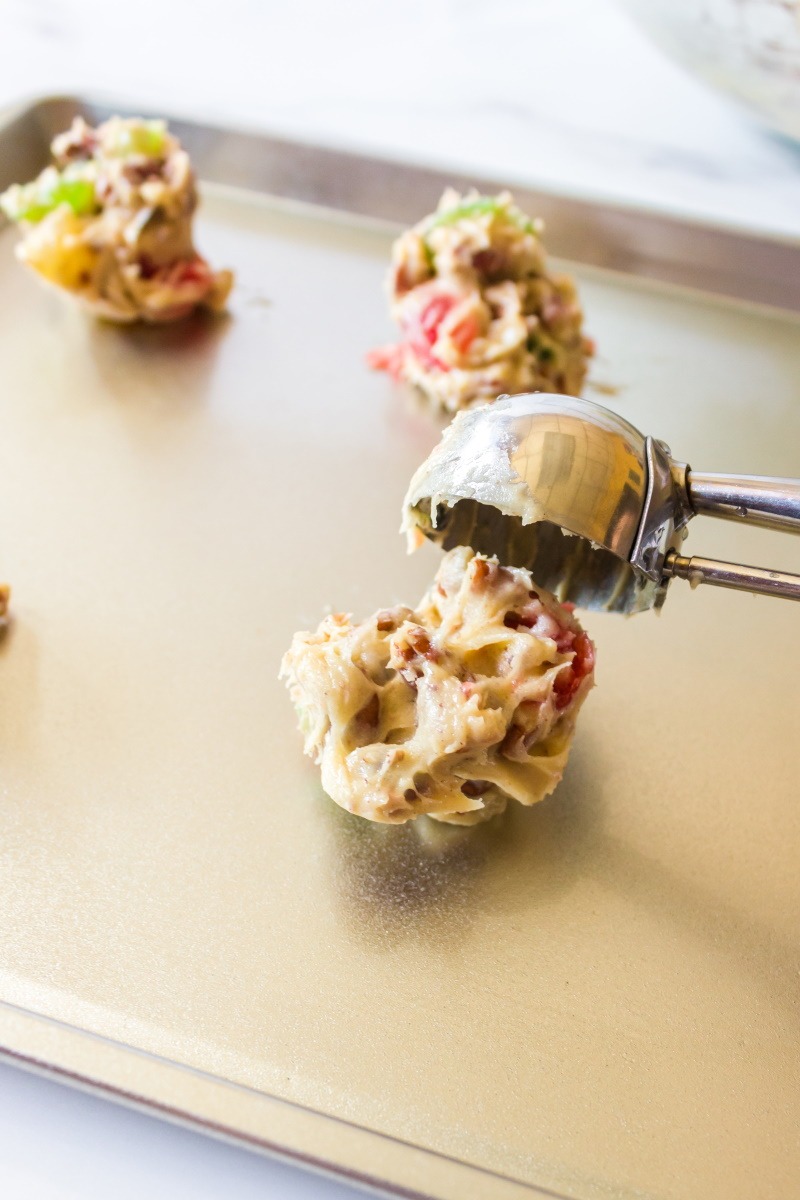 The base of the cookie is like a Snickerdoodle, with vanilla and cinnamon, and then we add a hint of lemon to balance out the sweetness of all that candied fruit. The pecans add a bit of a crunch to the already soft, chewy, deliciousness.
