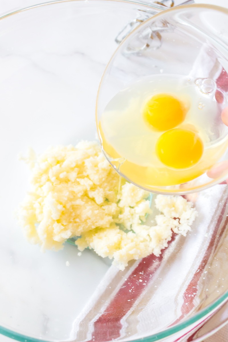 - In a large bowl, cream together butter and sugar using a hand mixer.