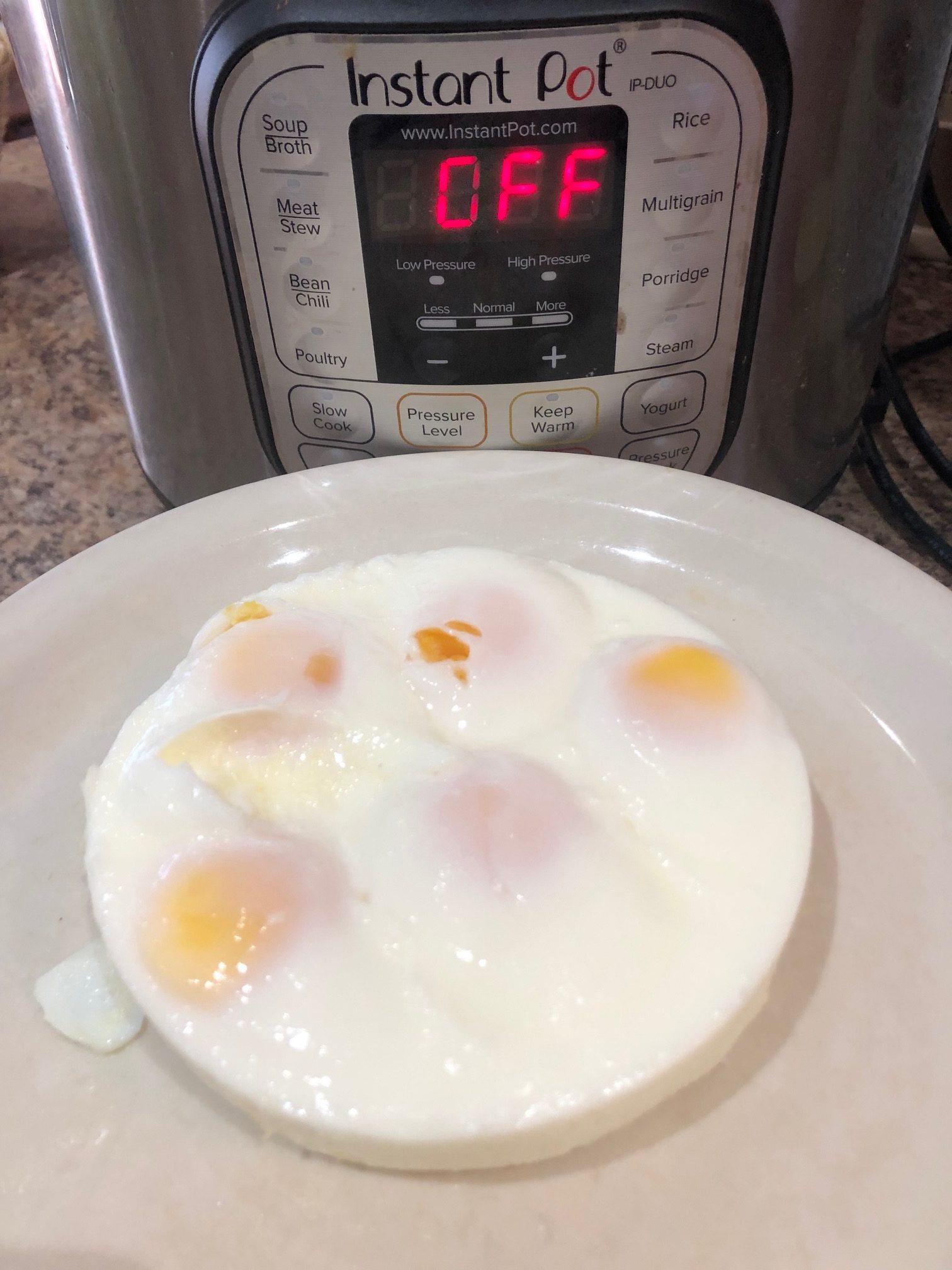 Crack your eggs into an oven proof dish, set into the Instant Pot, cook 5 minutes.  Do pressure release.  Invert cooked egg “loaf” onto a paper towel lined plate and let cool fully.