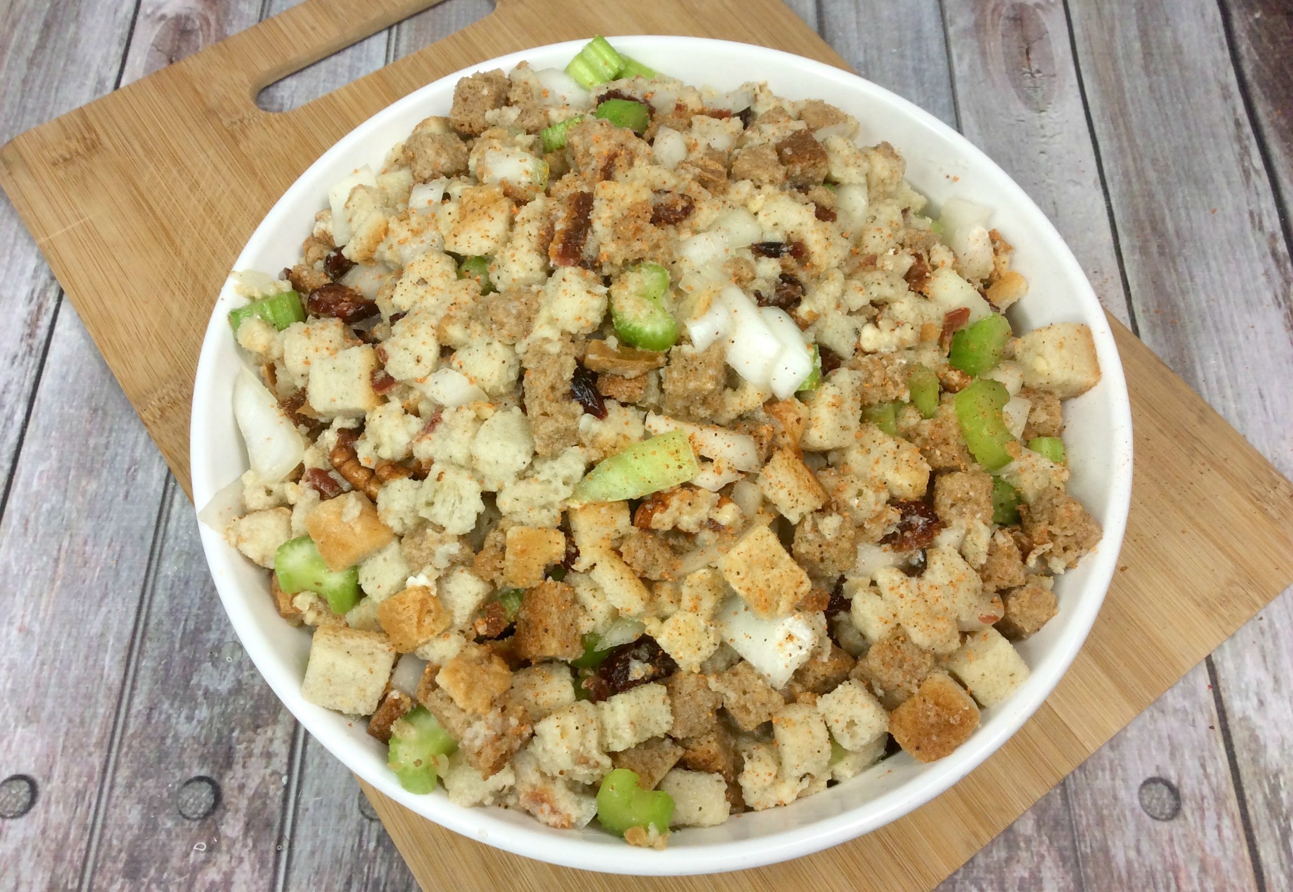 - Combine butter, broth, celery, and onion in a pot simmering until tender. Add salt, sage, garlic, and pepper. Stir in the butter mixture. Put bread into a large bowl. Stir in the bacon, cranberries, and pecans in with the bread. Pour your butter/ spice mixture over the bread. Mix well.