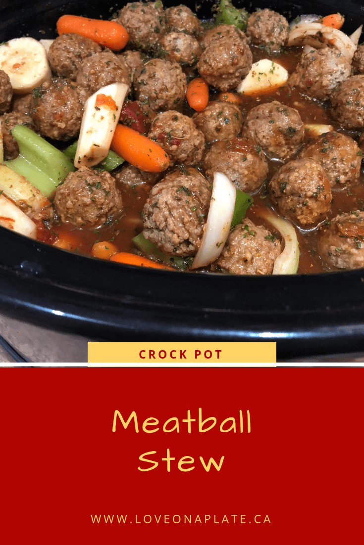 - Combine meatballs, celery, carrots, red onion, potatoes, salt, pepper, garlic, parsley, oregano, Worcestershire sauce, beef broth, and tomato sauce in the crock pot. I used a 6 qt Crockpot for this stew. Cook on HIGH for 4-5 hours or LOW for 7-8hrs. Great for a work day dinner as it will be fine sitting on warm until you get home.