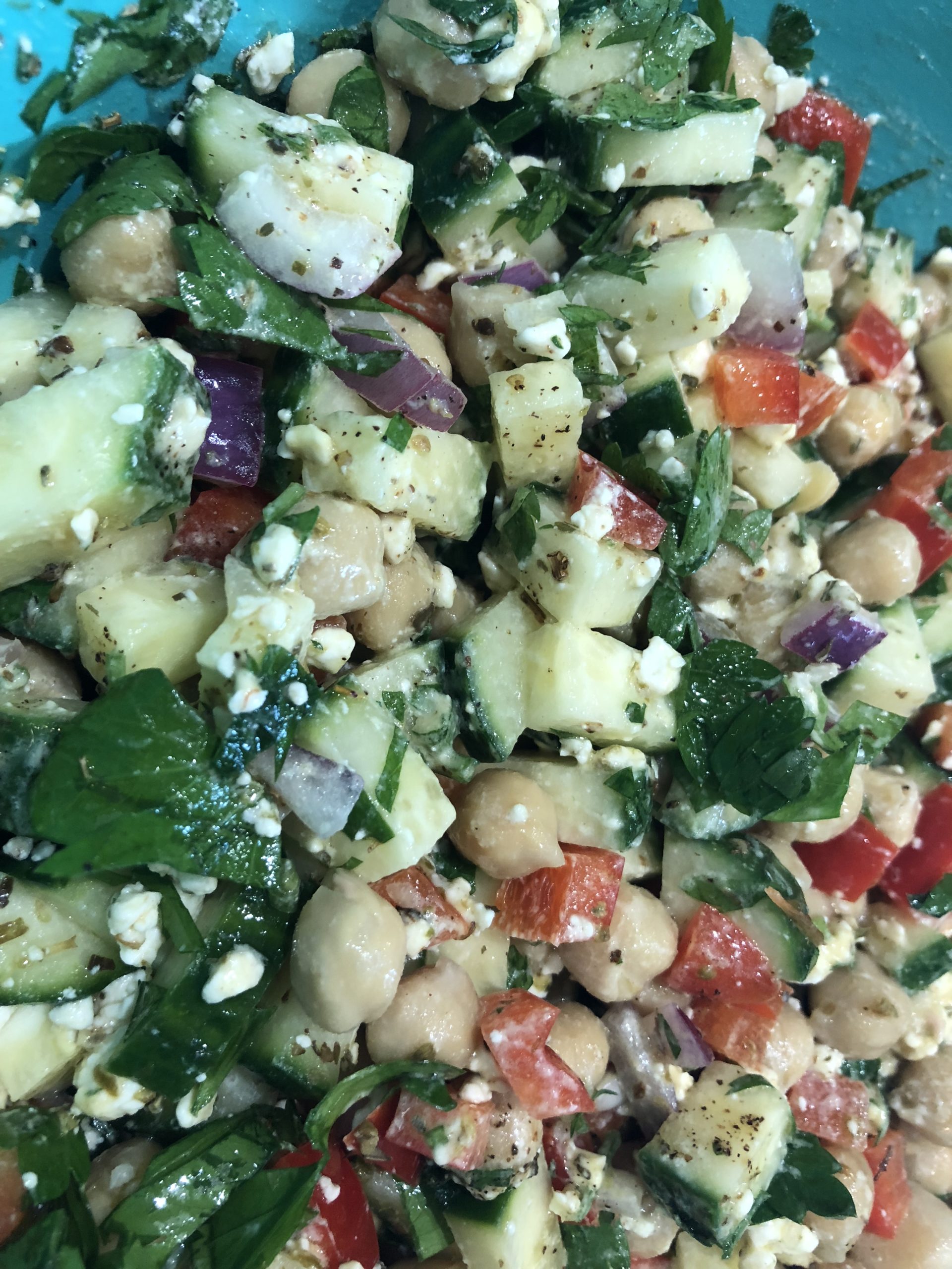 - In a large mixing bowl combine chickpeas, tomatoes, red pepper, red onion, cucumber, parsley and Feta Cheese. Toss well.