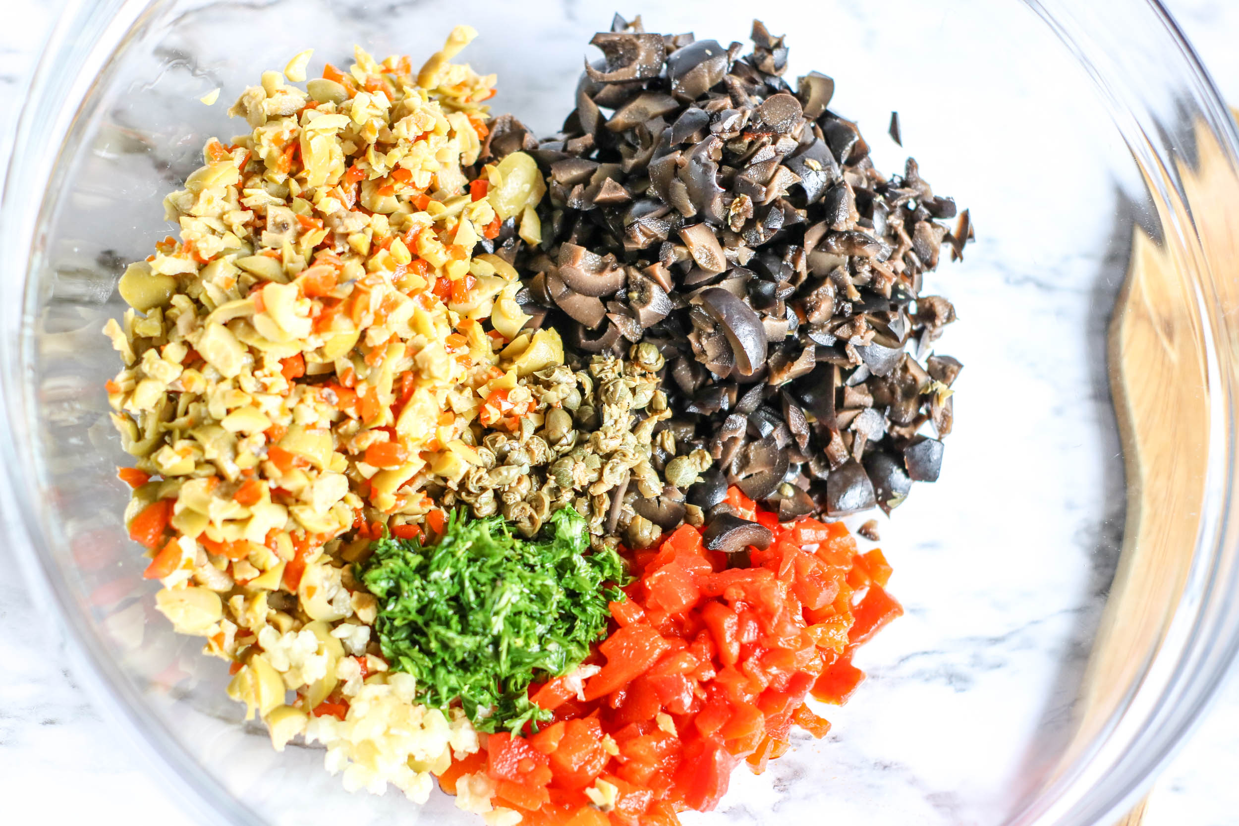 It starts off with a delicious yet easy recipe for homemade Olive Salad that I make in larger batches and keep on hand in the fridge, so it’s really comes together quickly. If you’re in a rush, you can use a store bought Muffaletta salad, I’m not judging. I will say it’s worth the extra 10 minutes to make it from scratch though….