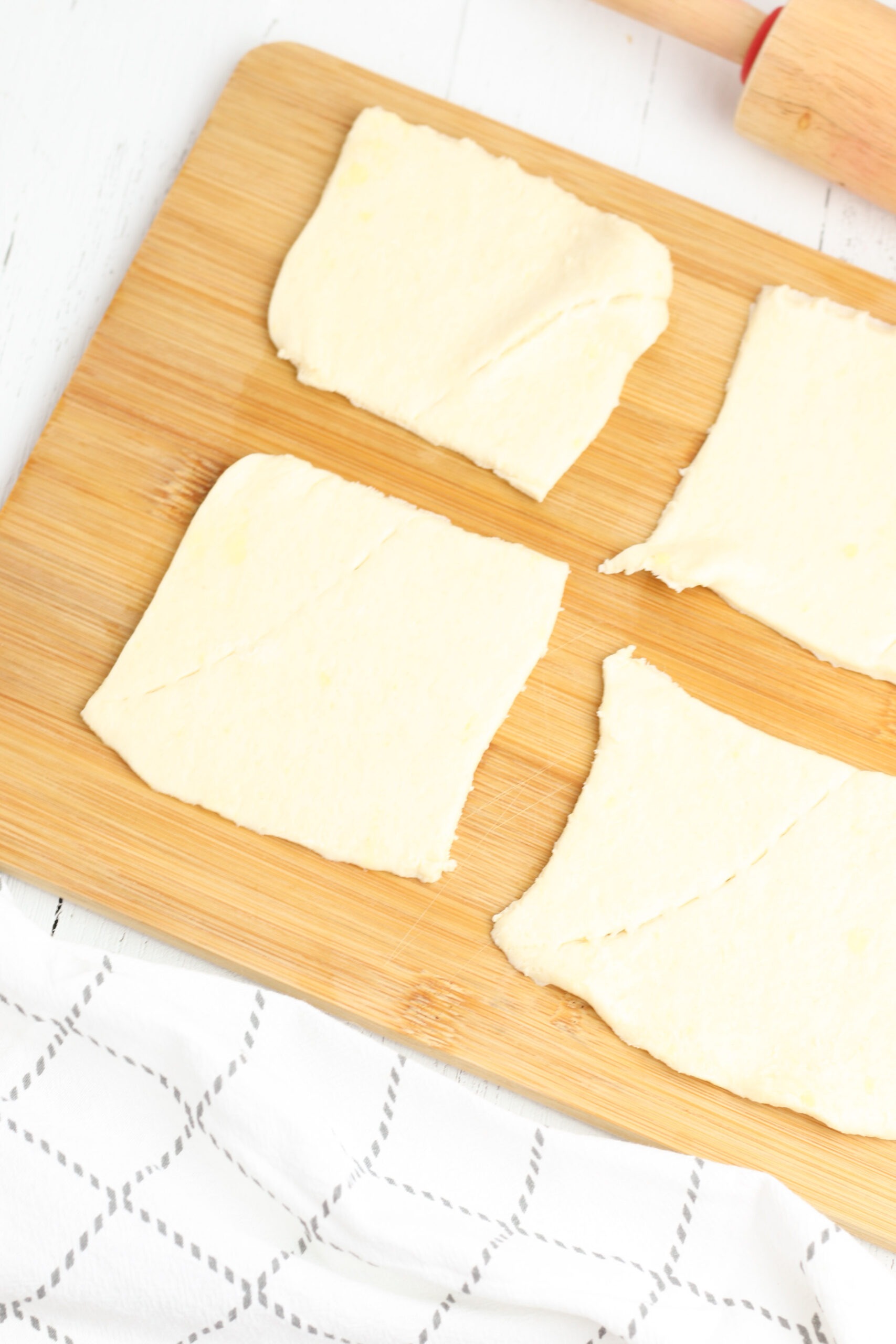 - Unroll crescent roll dough and separate into 4 sheets. Roll the dough flat with a rolling pin and cut into 8 squares using a sharp knife.