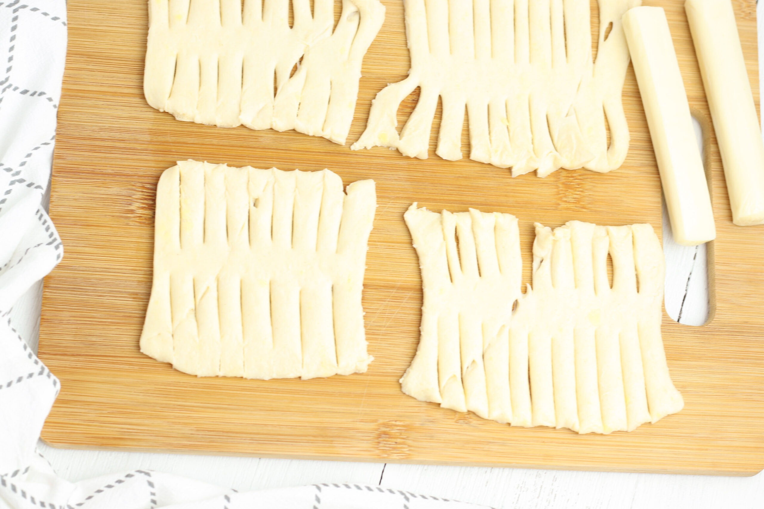 Now it’s time to turn your crescent roll dough into mummies! Using your knife, cut strips into each side of the square. But be sure to leave the center of the square intact. That’s where you’ll put your cheese, so if you leave lines in the back of the mummy, the cheese will leak out as it bakes.