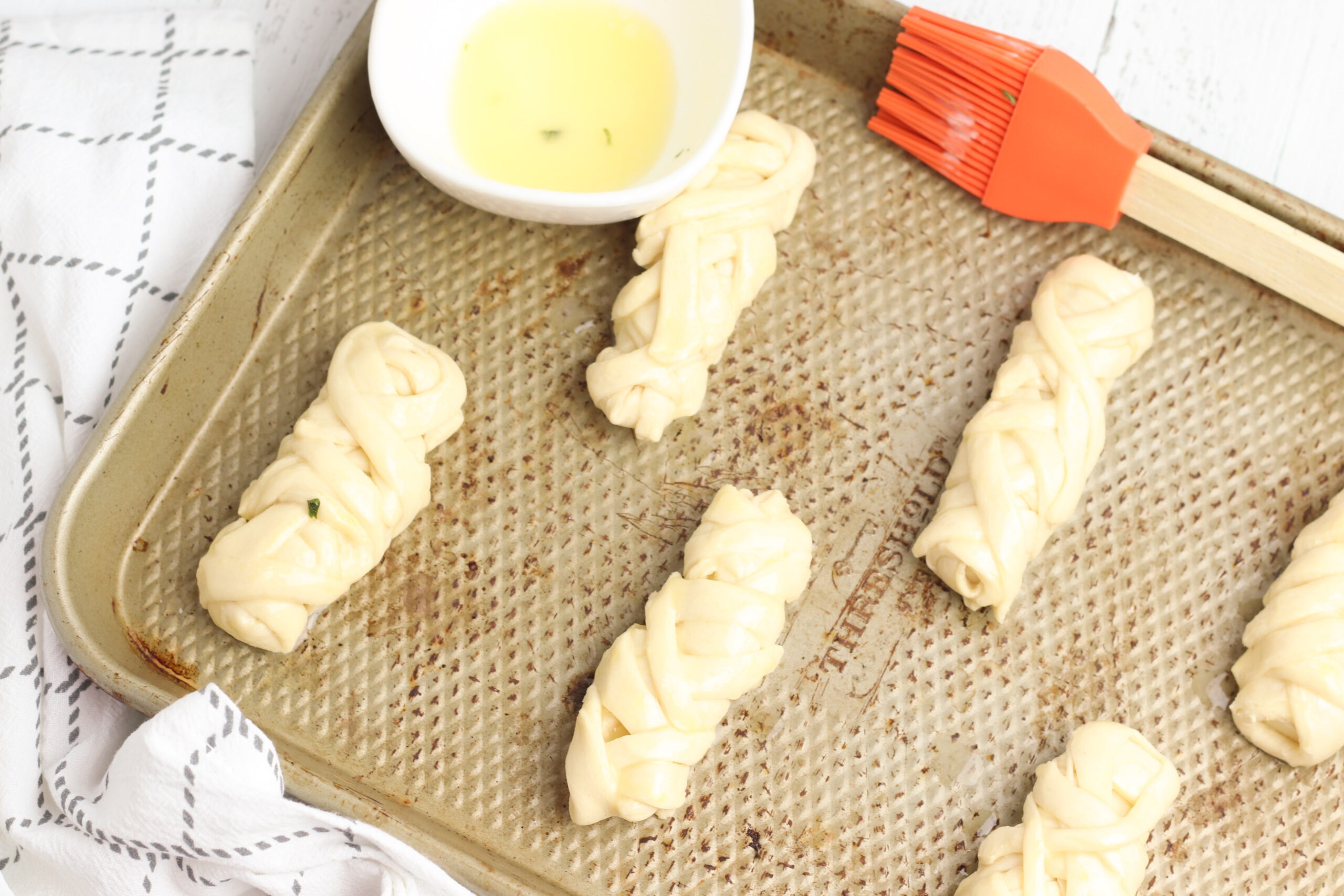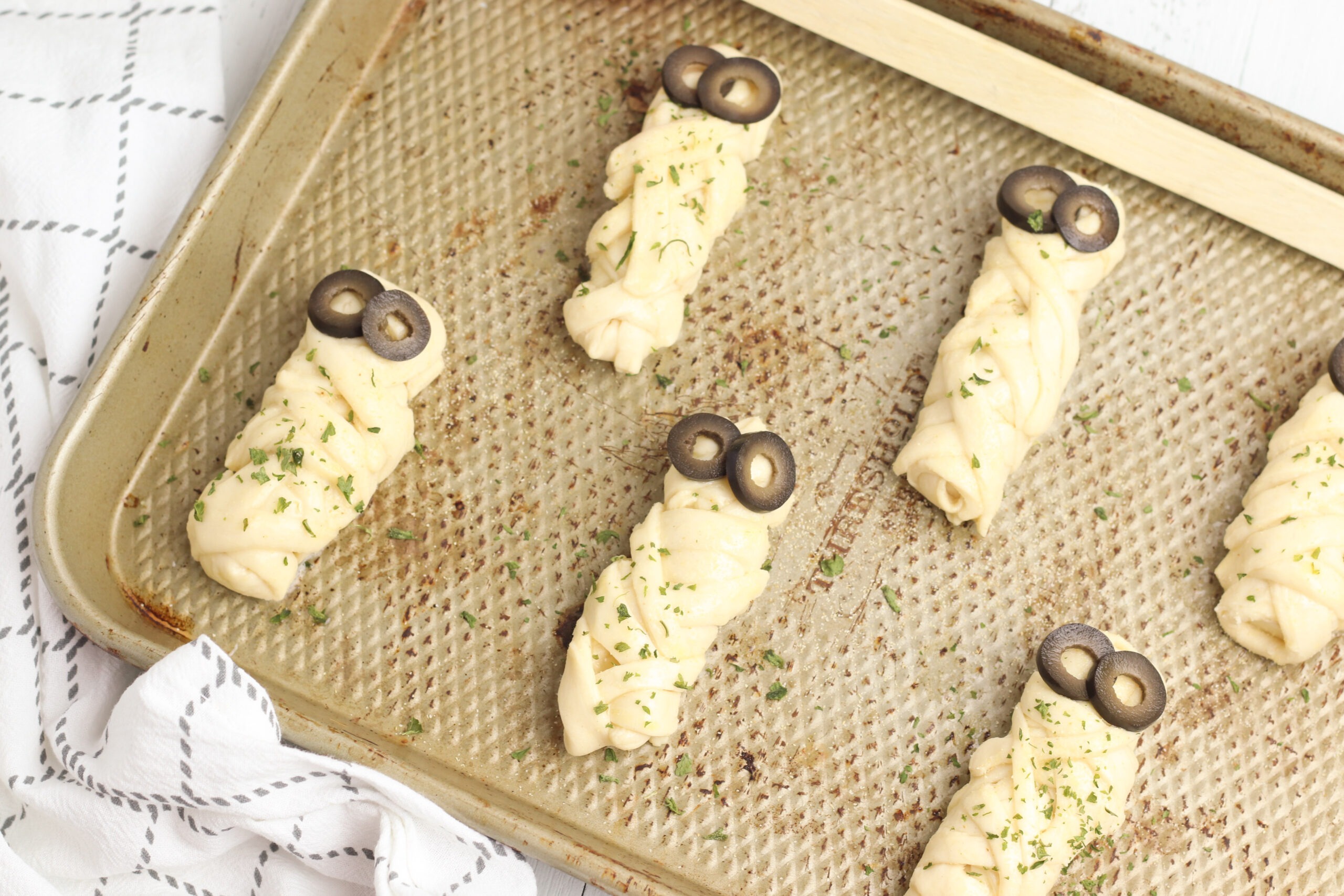 - Place the breadsticks on an ungreased baking sheet. Brush the breadsticks with melted butter, then sprinkle with garlic powder and dried parsley. Place two sliced olives at the top of each breadstick to resemble eyes.