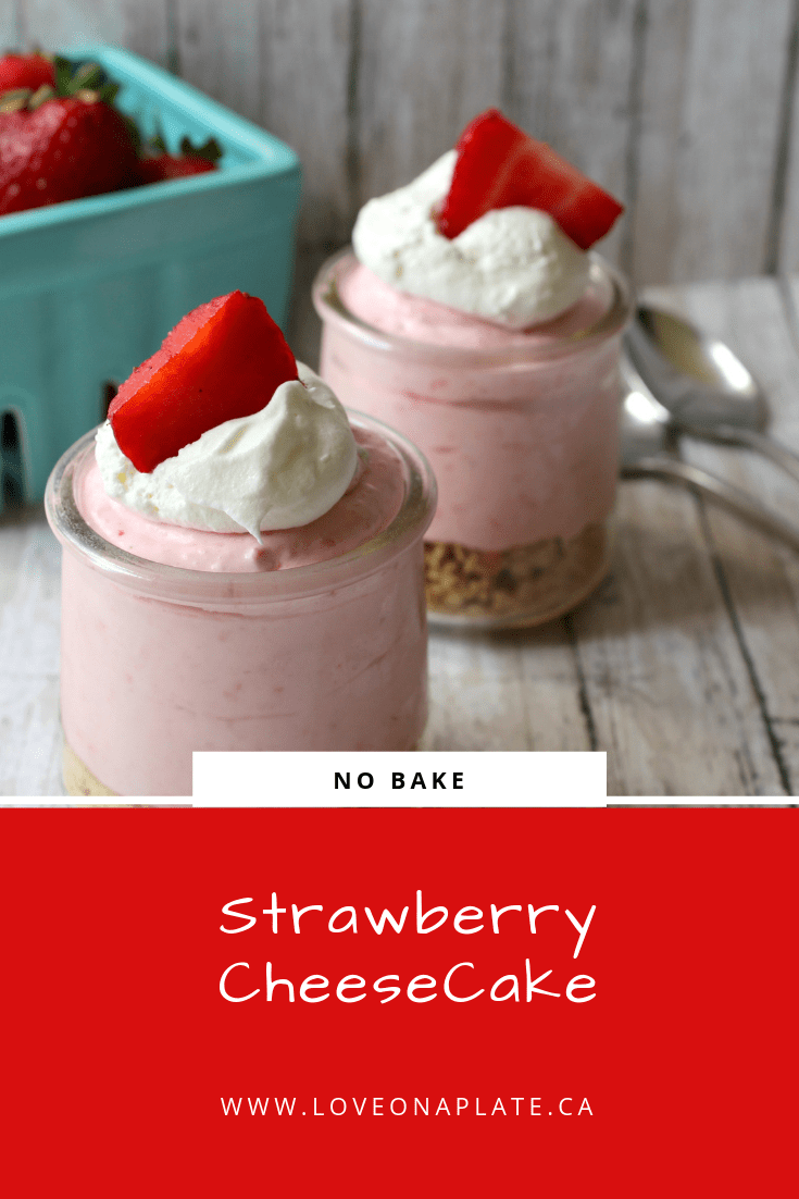 After the long days of winter, I welcome the chance to cook with fresh in season fruit, and strawberries are one of my favourites. They begin to make an appearance in early June, and I find them readily available all summer long. Of course if it’s out of season you absolutely could use frozen strawberries instead. No Bake Strawberry Cheesecake is easy to prepare, but it does require a little planning as it needs at least 3 hours to set in the fridge.