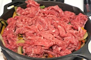 - Add the steak to the onion pepper mixture. Stir to mix.
