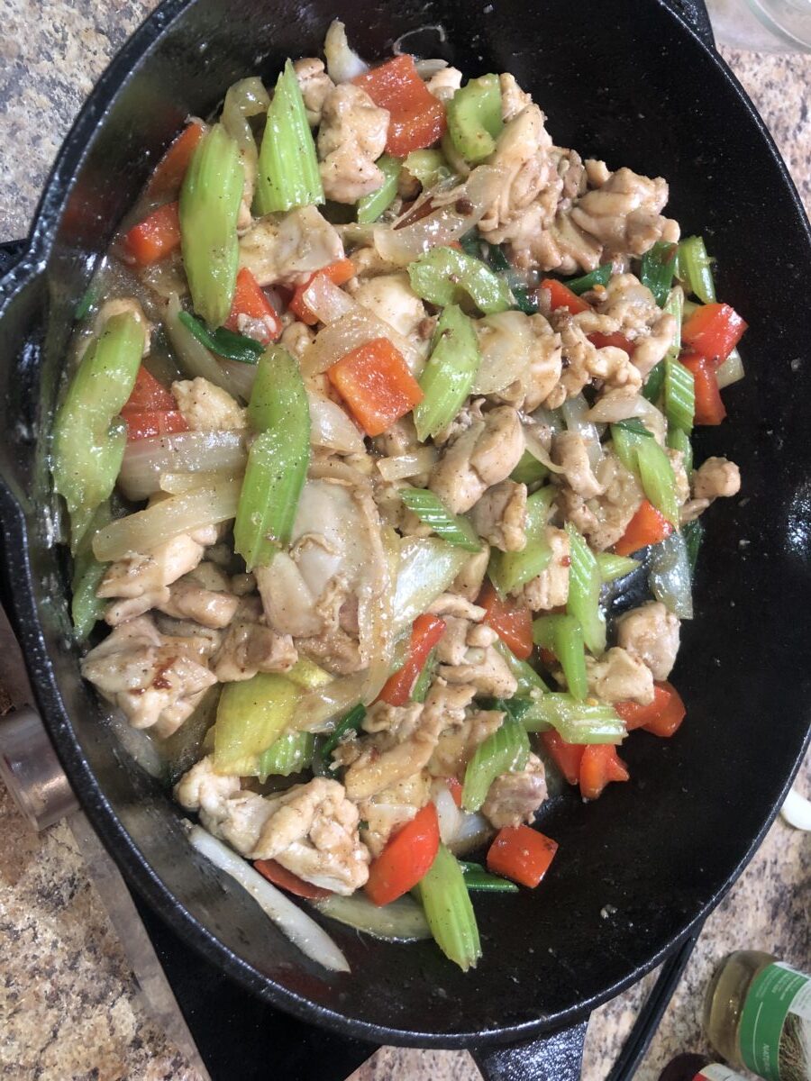 Stir fried chicken, celery slices, red pepper in a black pepper stir fry sauce in a skiller