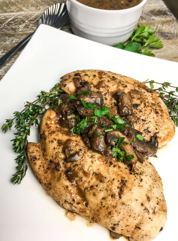 Seared chicken breasts with mushroom, onion, goat cheese sauce and a sprinkle of chopped parsley on a square white plate.