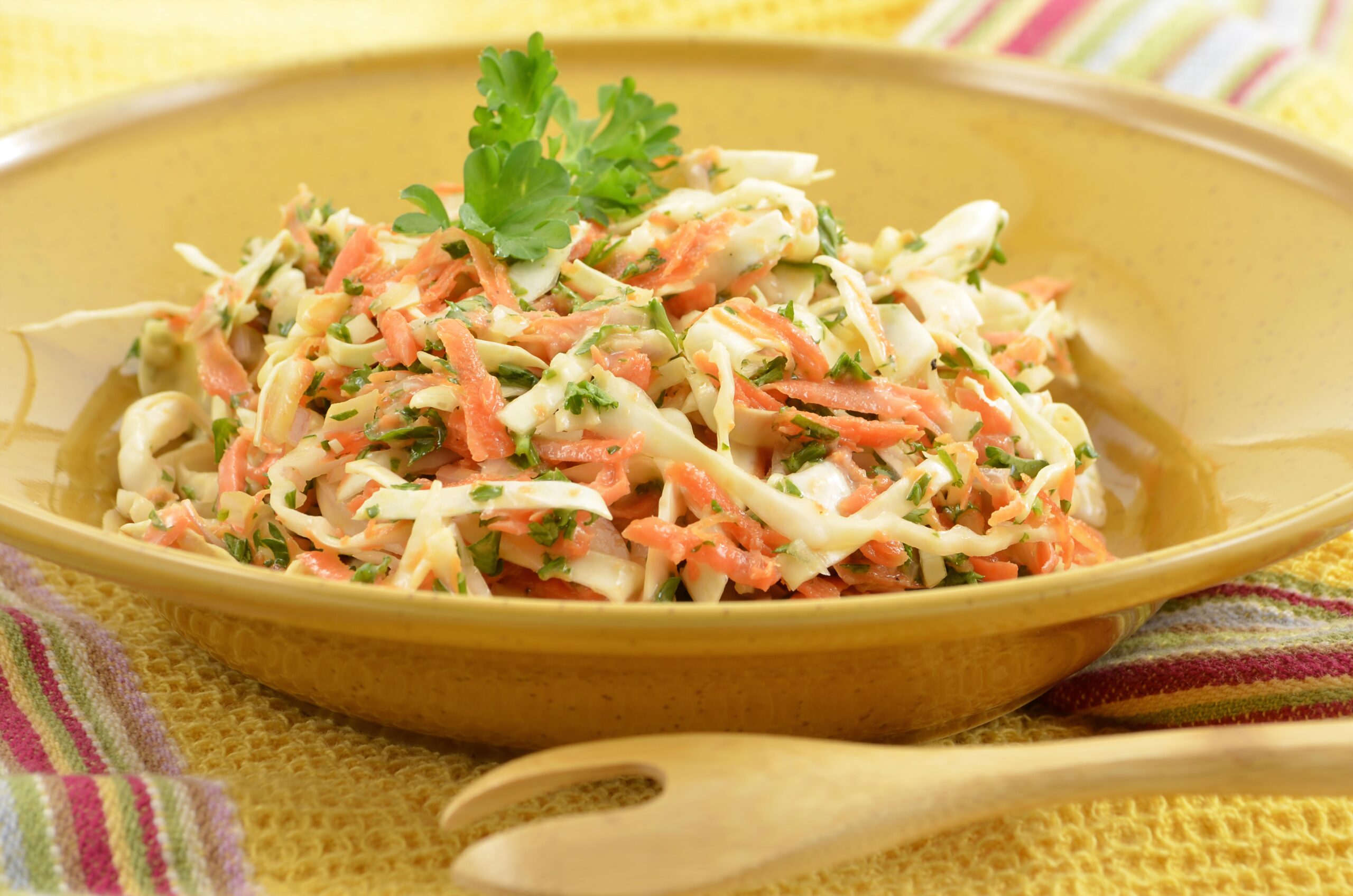 Shredded green and purple cabbage, carrots, with pineapple and cilantro in a large serving bowl with a wooden serving spoon.