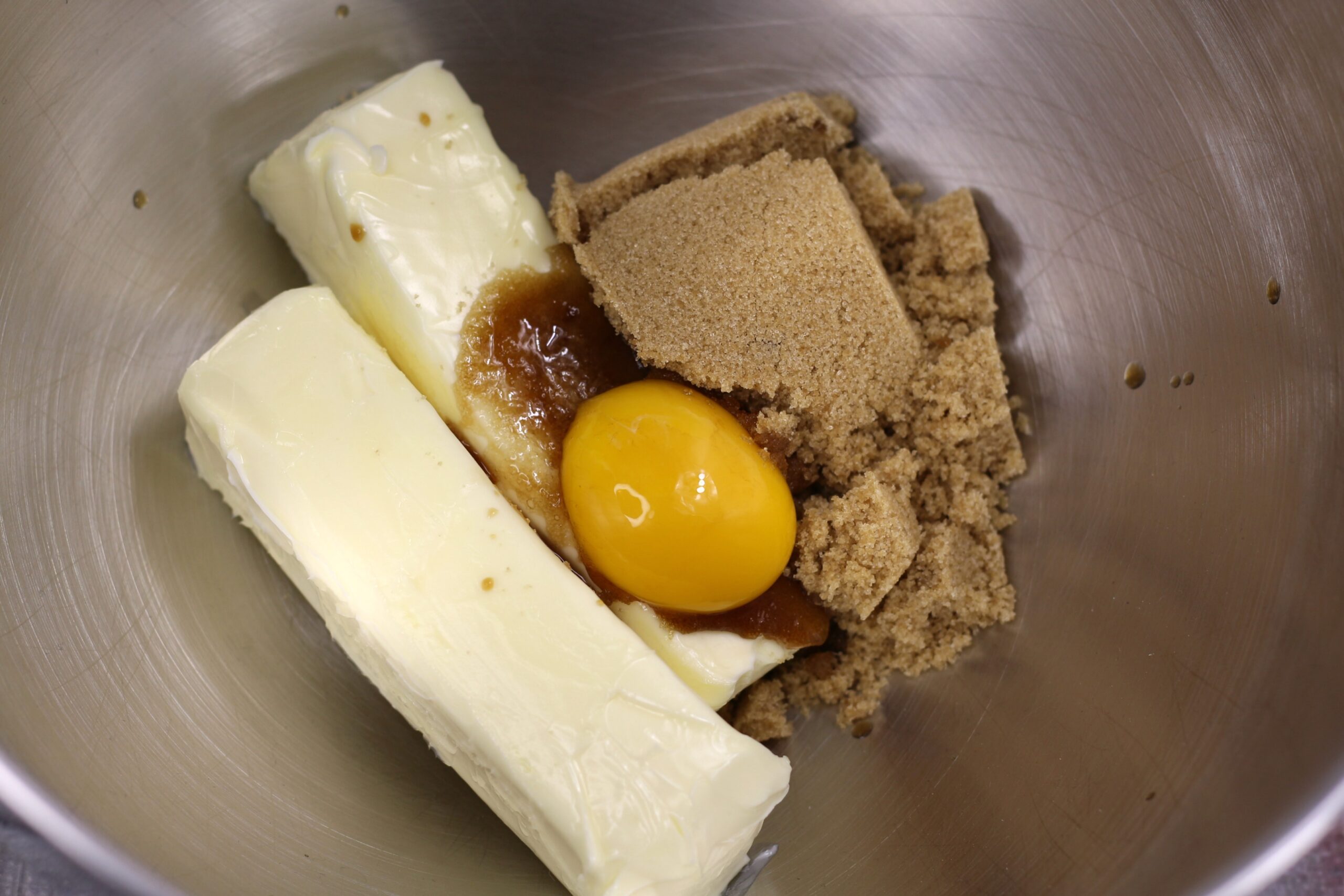 - Using a standing mixer, beat together the butter, brown sugar, egg yolk, and vanilla until light and fluffy.