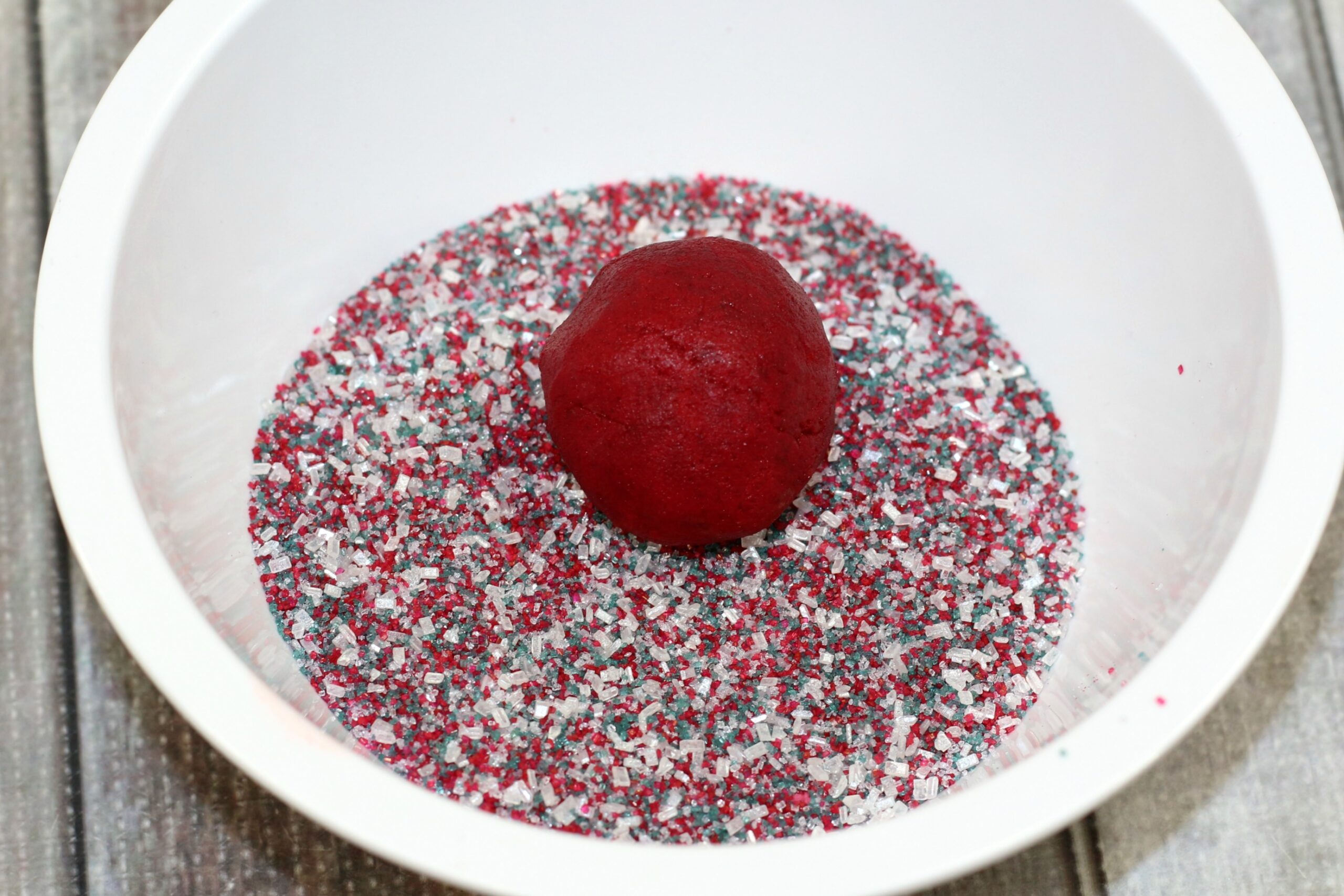 - Roll the dough ball into the sanding sugar and set aside onto the cookie sheet. Repeat steps for about 11 more cookies