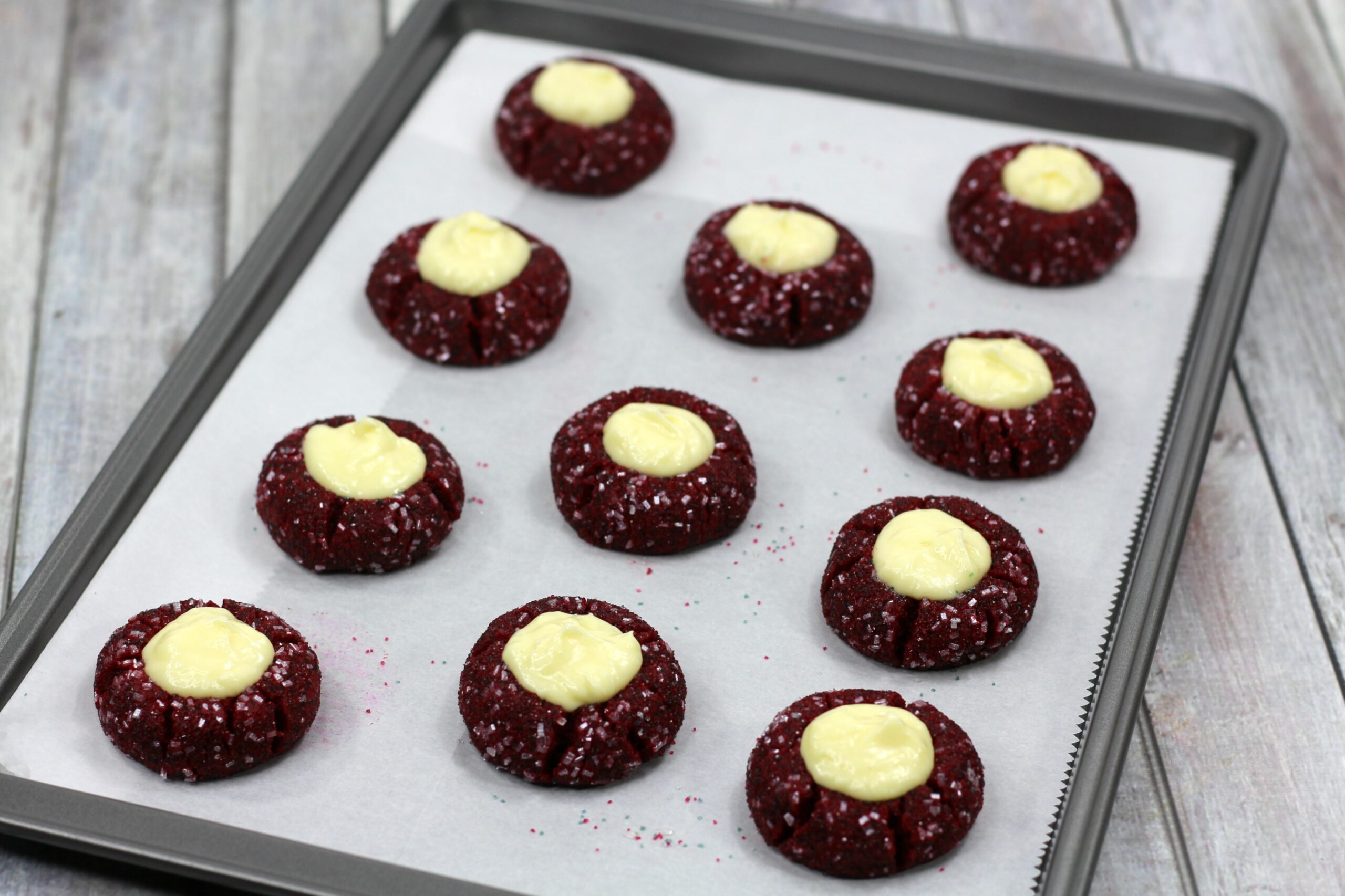 Tender chocolate red velvet cookies, with a surprise cream cheese filling. These extra special Holiday Thumbprint cookies are perfect for Valentines Day and Christmas.