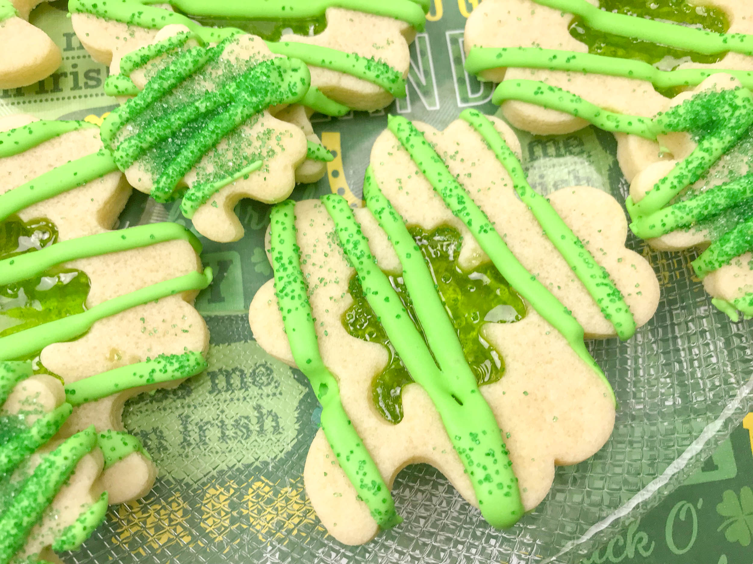 Shamrock stained glass cookies will make a nice ending to your St. Patrick’s Day feast. They are festive, can be made ahead and they look pretty on the plate.