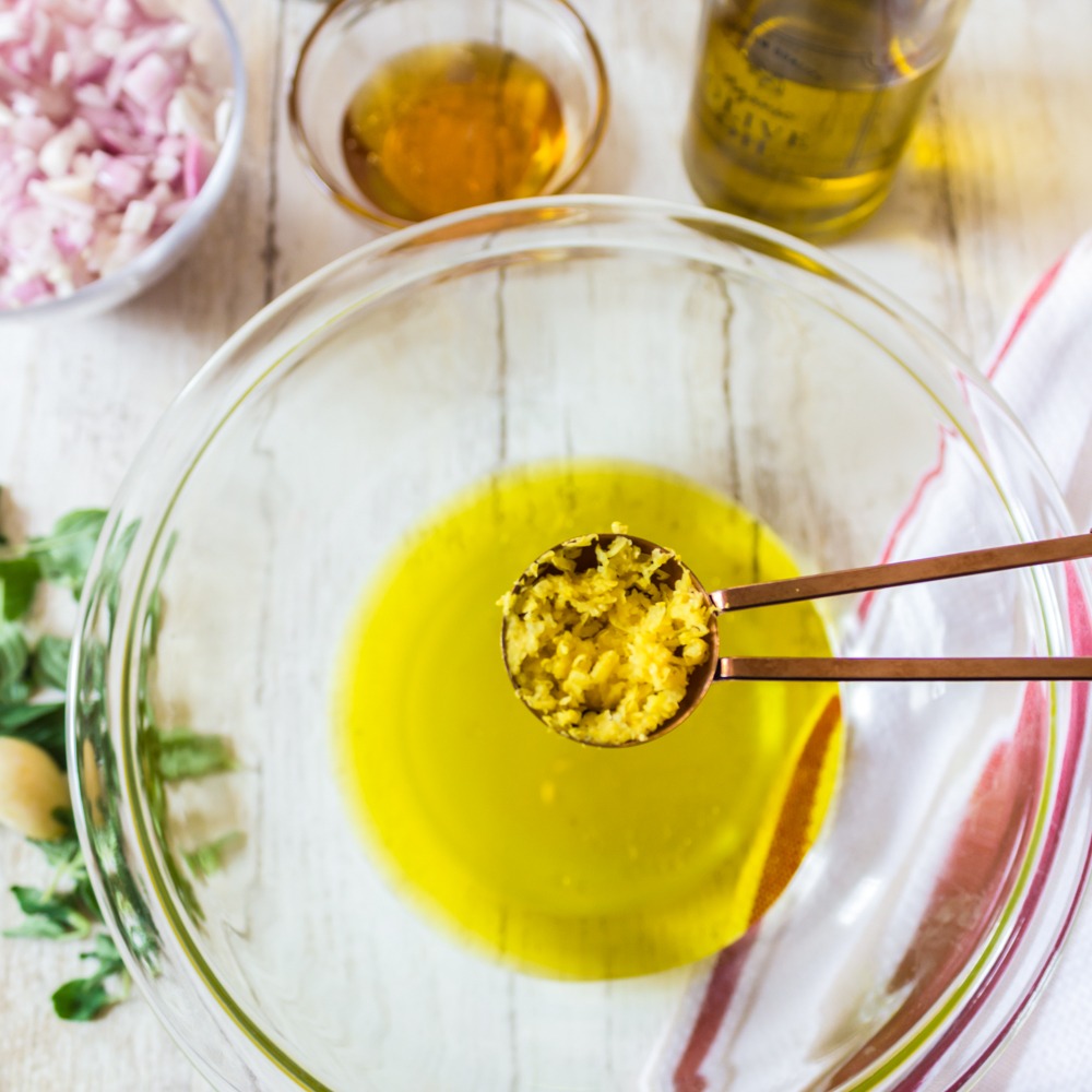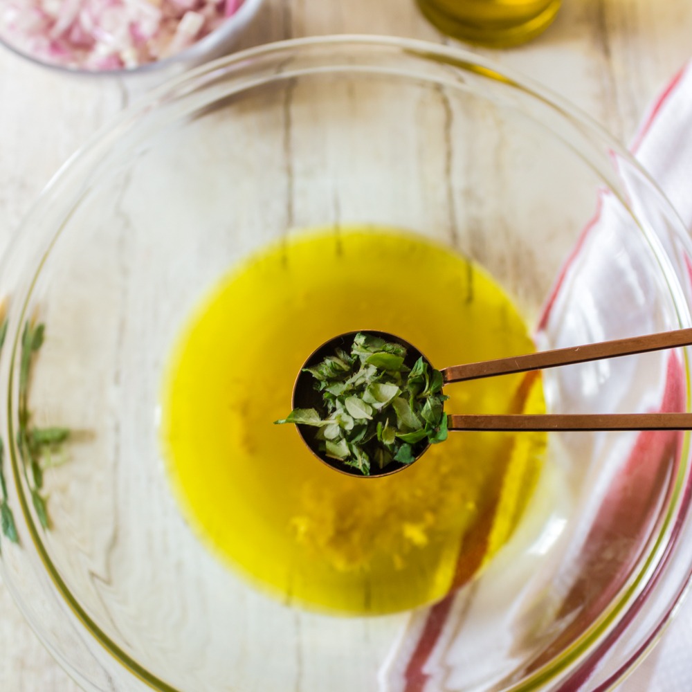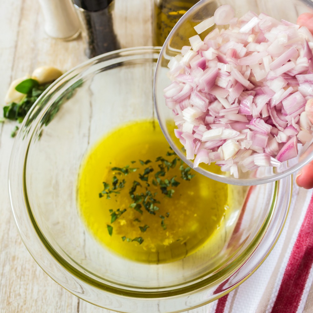 - In a large bowl, whisk together olive oil, lemon juice, zest, honey, garlic, oregano, and shallots. Season with salt and pepper to taste. Set aside.