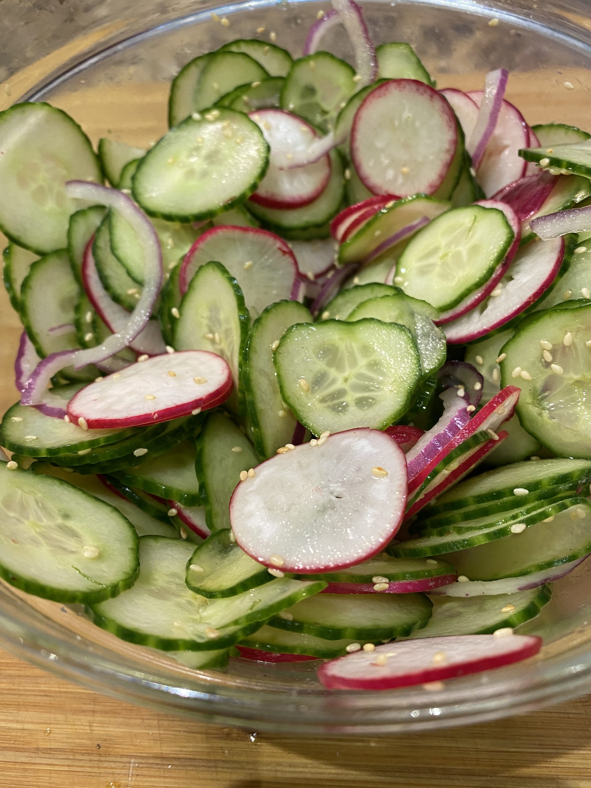 Using a mandolin or a very sharp chefs knife thinly slice cucumbers, radish and red onion into a large mixing bowl. Toss well.