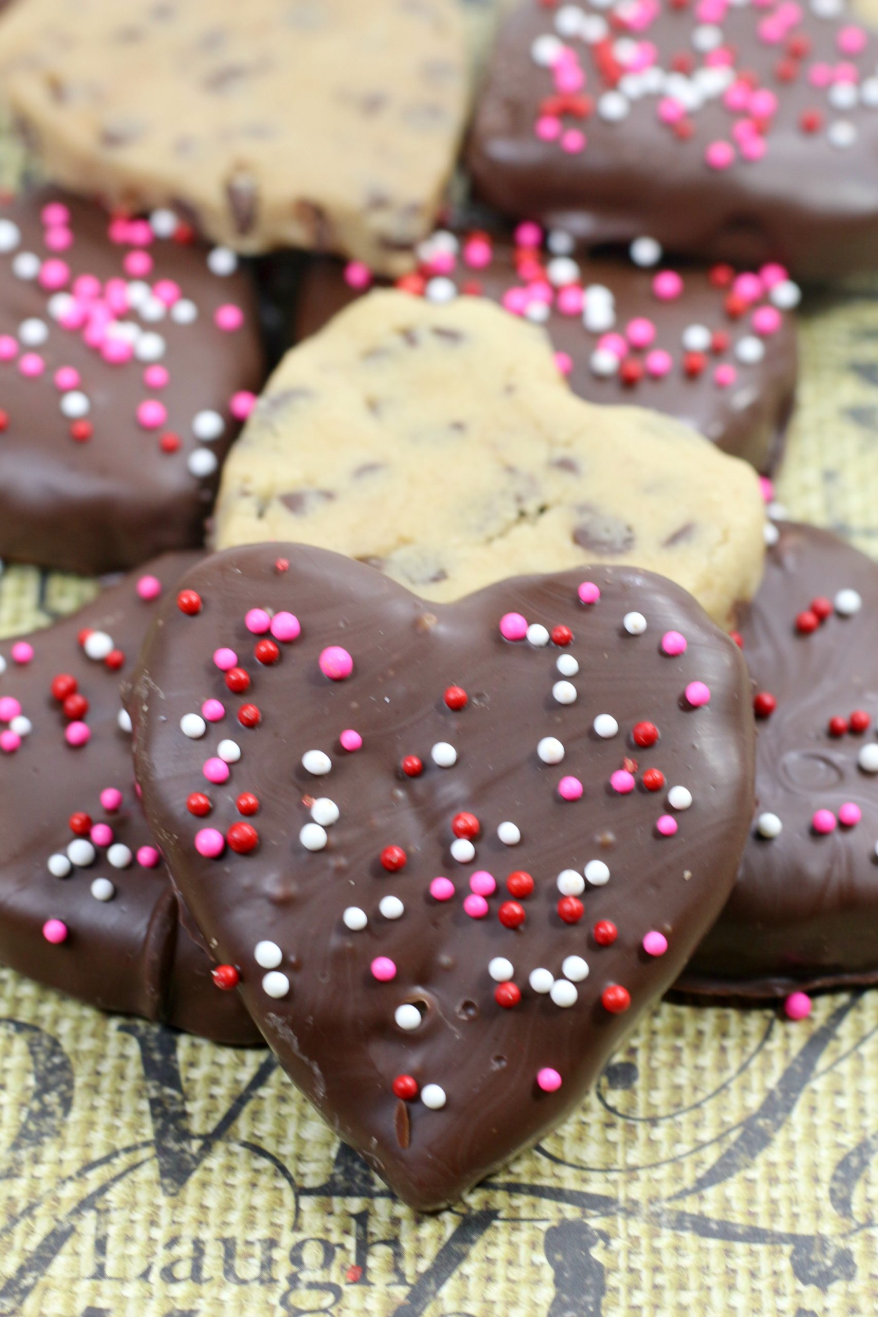 Valentines Cookie Dough Truffles, made in sweet heart shapes, dipped in chocolate and decorated with sprinkles. Everyone is going to LOVE them!