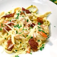 Garnish with parsley, crispy prosciutto, and freshly grated parmesan