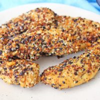 Sprinkle the Everything Bagel seasoning on each chicken tender, on both sides, and place the tenders at 400F on air fry in the air fryer for 12 minutes, turning half way through the cooking time.