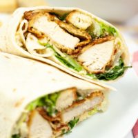 Best ever Chicken Caesar wraps, homemade garlicky Caesar dressing, moist chicken, crunchy croutons , crisp romaine all wrapped up in a flour tortilla. Use grilled, rotisserie or Air Fried chicken tenders.