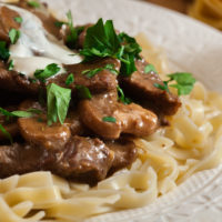 Serve over cooked egg noodles or rice. I also like to stir the cooked noodles directly into the sauce in the crockpot, stir well and let thicken up a bit. DE LI CIOUS!